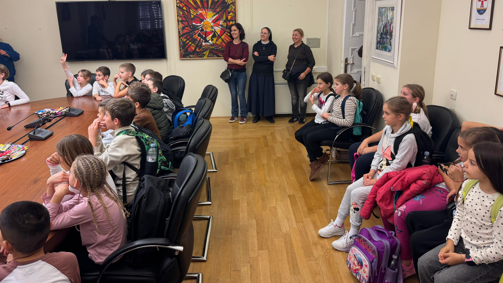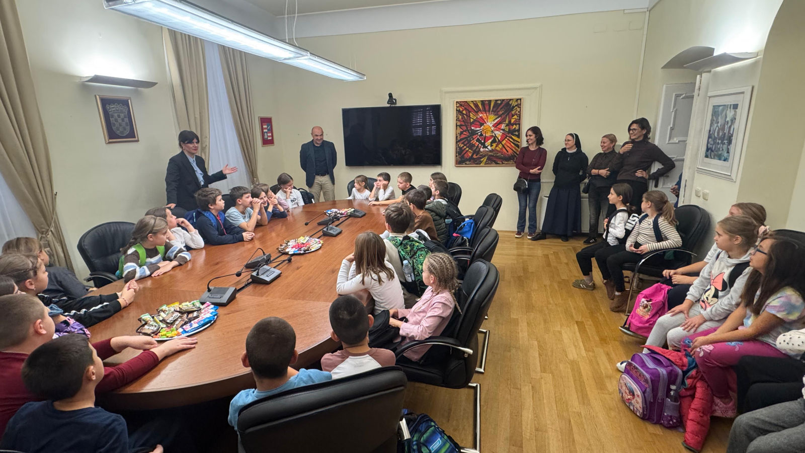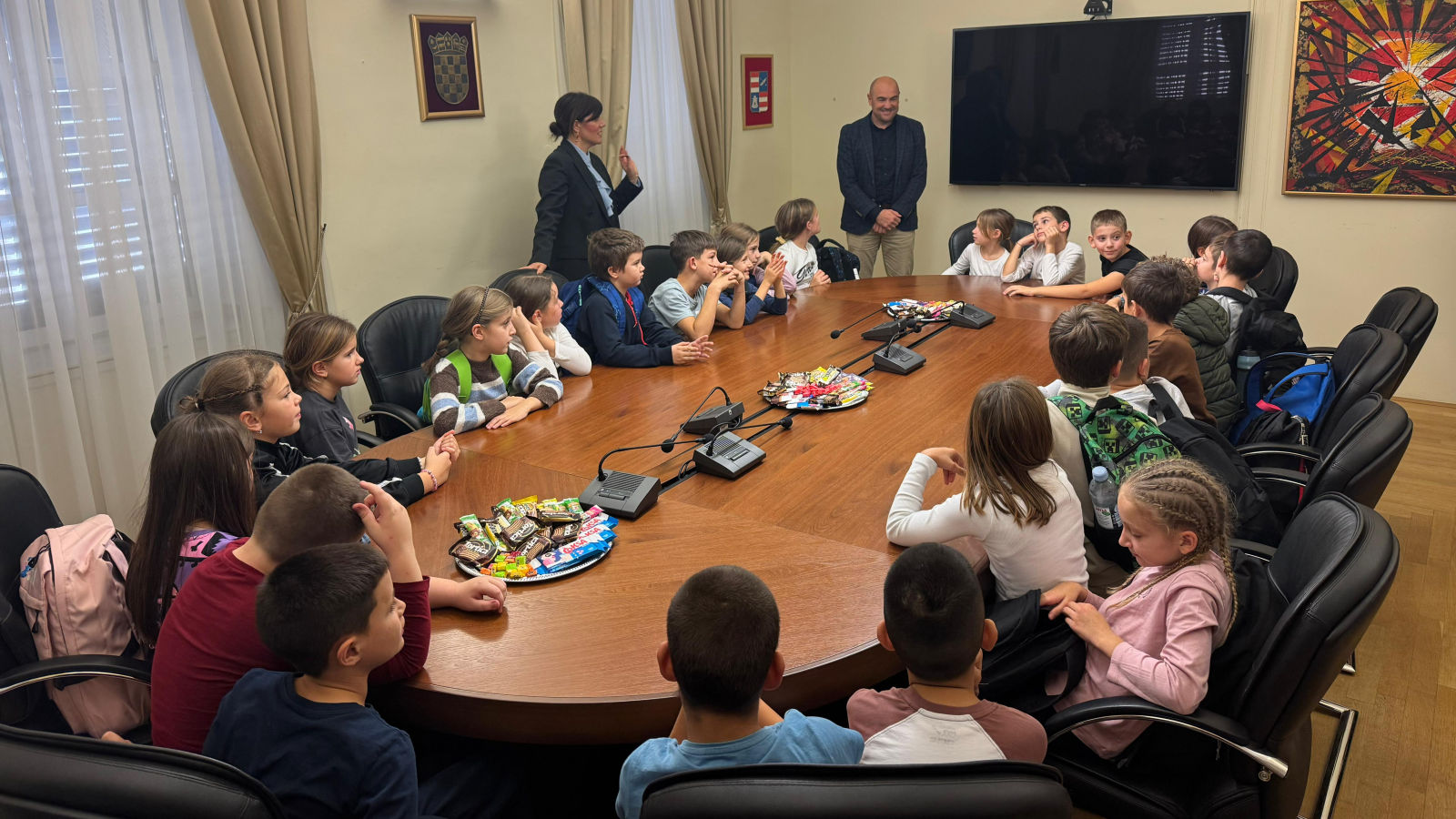 Župan dubrovačko-neretvanski Blaž Pezo sa pročelnicom Upravnog odjela za obrazovanje, kulturu i sport Jelenom Dadić Račić i pročelnicom UO za poslove Župana i Županijske skupštine Žaklinom Marević primio je u Palači Ranjina učenike dvaju odjeljenja 3. razreda Osnovne škole Stjepana Radića iz Metkovića i njihove učiteljice.
