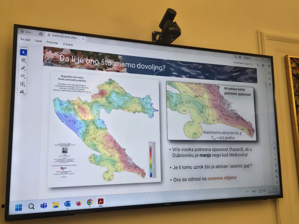Stipčević je tom prigodom kazao da je zahvaljujući potpori Dubrovačko-neretvanske županije i u suradnji s Hrvatskim telekomom d.d. na našem području realiziran projekt DuFault. Zahvaljujući uspješnoj provedbi projekta mapirani su neki od aktivnih rasjeda, napravljen strukturno-tektonski model te izračunane osnovne simulacije potresa koji su mogući na području Dubrovačko-neretvanske županije. Na projektnom je području također je postavljeno 11 novih seizmoloških postaja koje čine mrežu privremenih seizmoloških postaja nazvanu Du-Net. Postavljanjem guste mreže seizmografa poboljšat će se preciznost lokacija potresa i bolje upoznati seizmičnost dubrovačkog područja, zajedno s detaljnom analizom recentne seizmičke aktivnosti i važnih povijesnih potresa. Projektima koji se trenutačno provode na našem području i dalje se istražuje dubrovački rasjed, a u suradnji s Hrvatskim telekomom d.d., postojeći podmorski svjetlovodni kabeli iskoristit će se kao detektor potresa kako je to ranije napravljeno i na kopnu u duljini od 17 kilometara između Grude i Vitaljine. Radi se o primjeni takozvane DAS tehnologije koja se prvi put u Republici Hrvatskoj i među prvima u Europi koristila u seizmološkim istraživanjima.